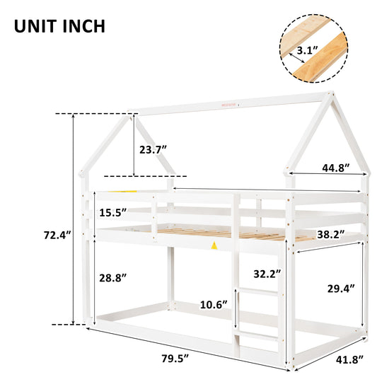 Twin Over Twin Loft Bed With Roof Design, Safety Guardrail, Ladder