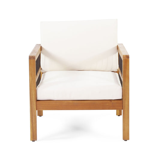 Acacia Wood And Wicker Outdoor Club Chair, Deep Seating With Soft Cushion, Porch Chairs For Garden, Backyard Porch Balcony - Brown / Beige