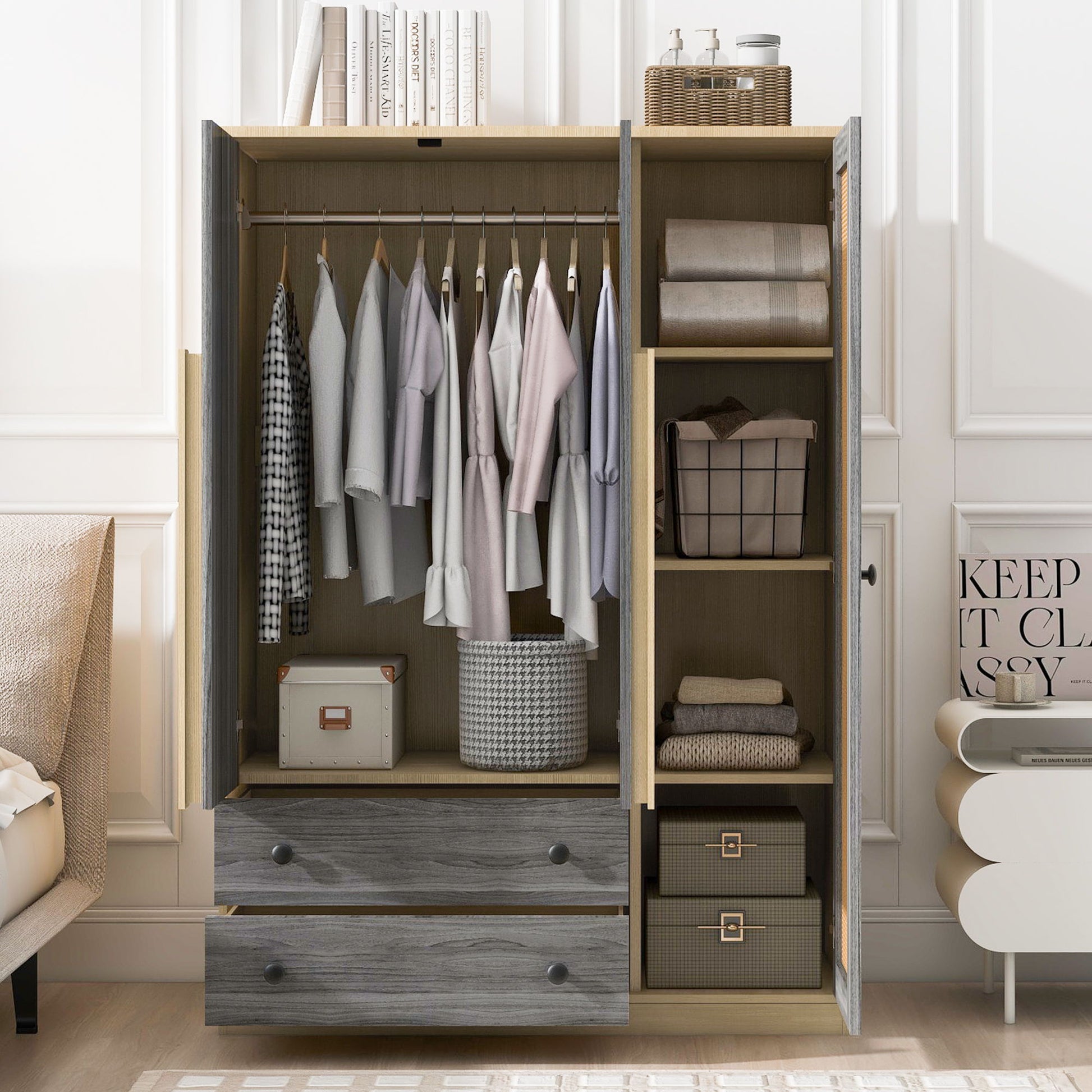 This stylish three-door wardrobe, perfect for any modern home. The left side features two small doors, one large door, a hanging rail, and two large drawers. The right side includes four independent storage spaces for versatile organization. With its unique dual-color design and rattan cabinet doors, this wardrobe adds elegance to your bedroom. Made from durable wood and MDF board, it supports up to 15 kg per shelf, hanging rail, and drawer for reliable storage.
