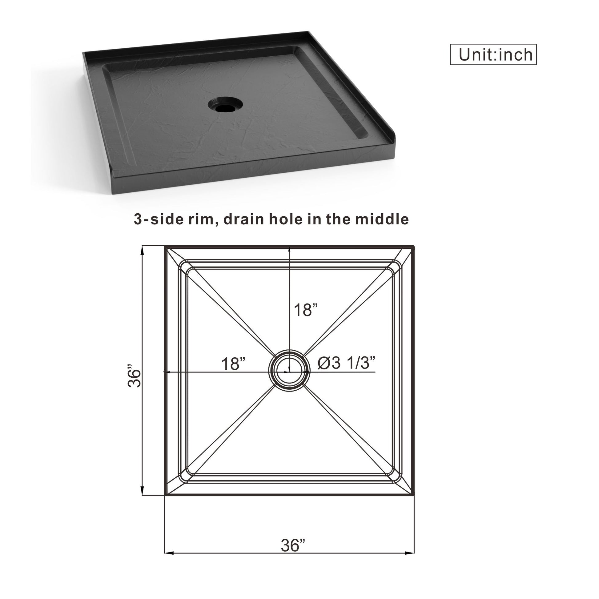 - Dimension: Measures 36L x 36W x 3.5''H with a 3.5" center drain
