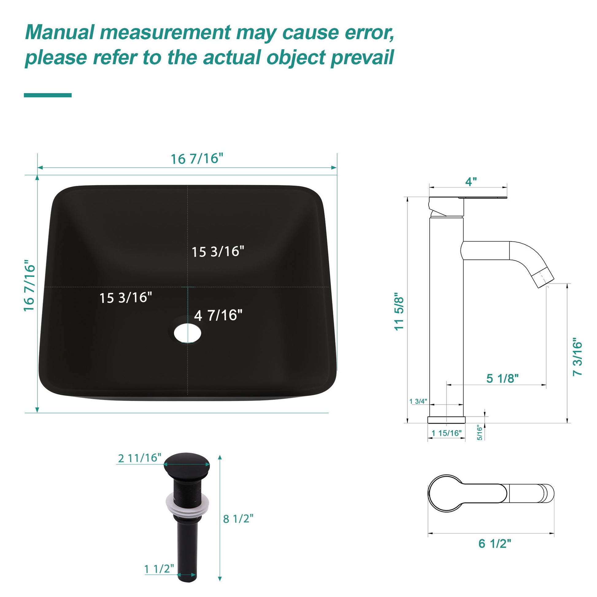 - Dimension & Accessories: Includes faucet, pop-up drain, and water lines; sink measures 16.42 x 16.42 x 4.41 inches.