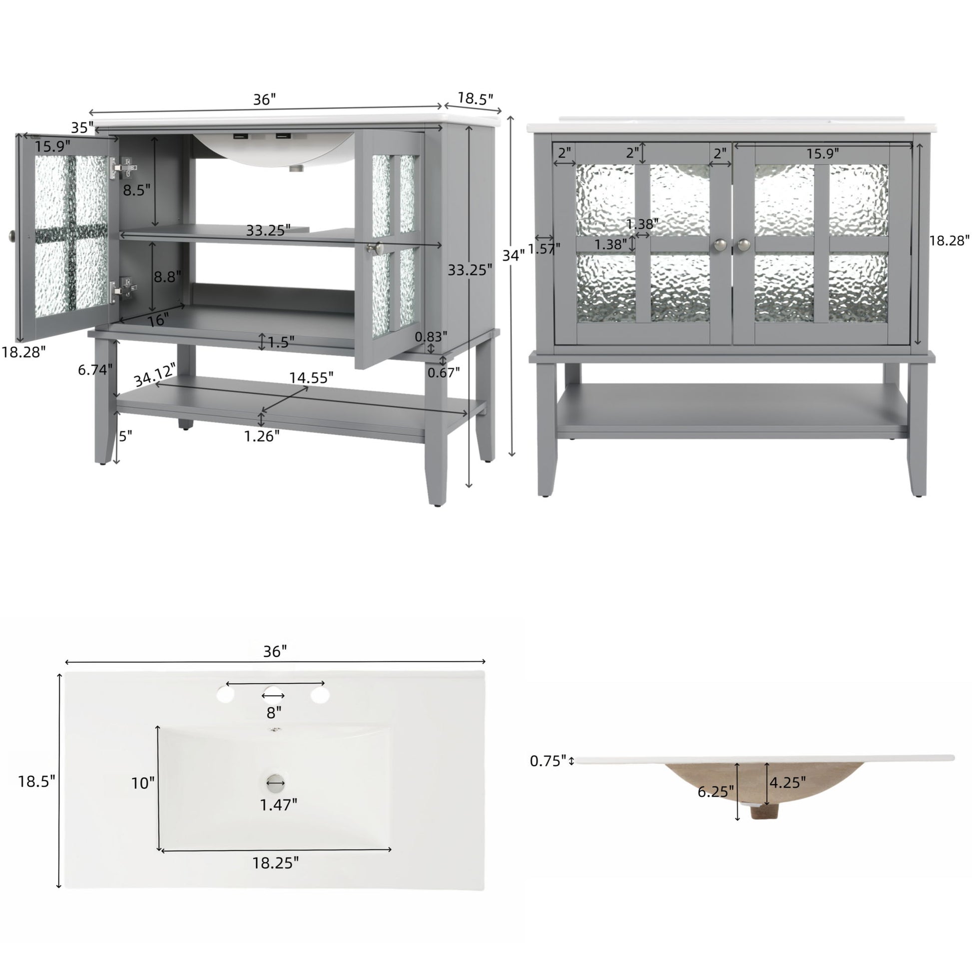 - Modern Touches-Textured Glass Doors & Pre-Drilled Faucet: Textured glass doors offer partial concealment; 8" pre-drilled faucet hole supports standard faucet installation.