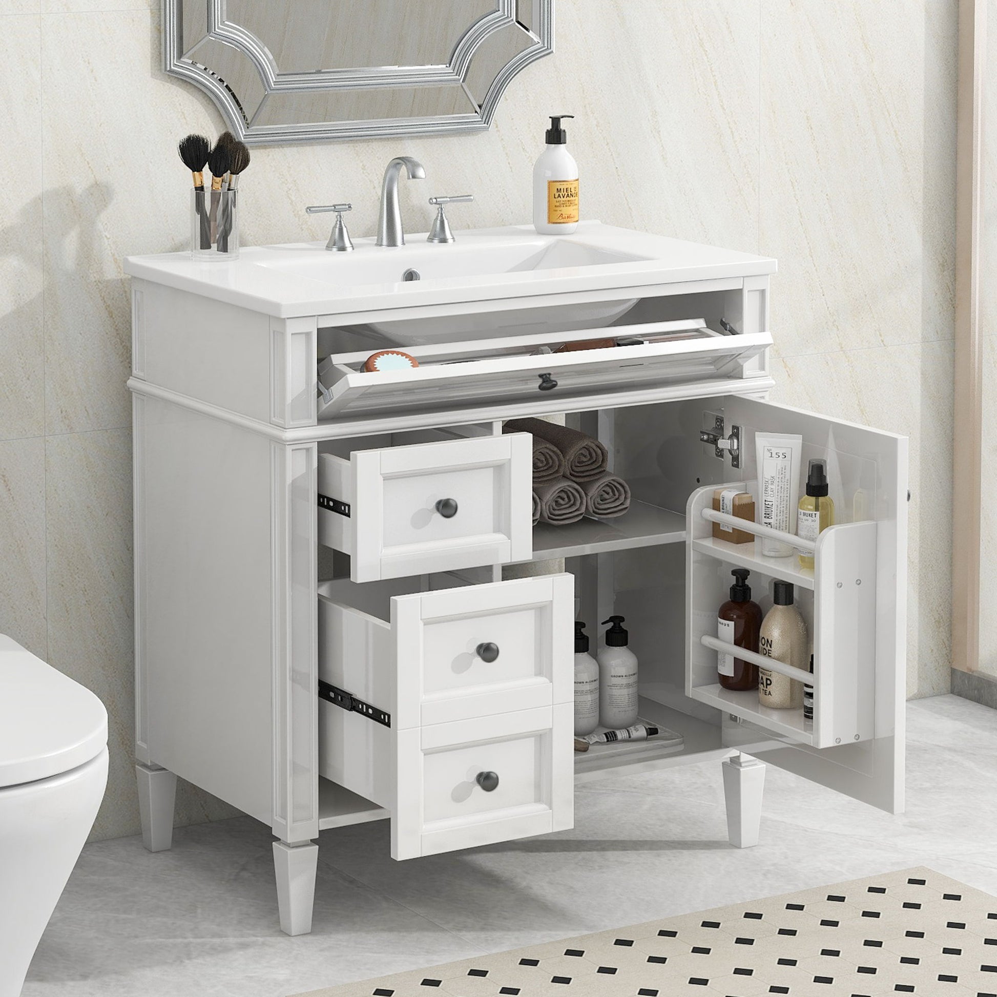 Bathroom Vanity With Top Sink, Storage Cabinet With 2 Drawers And Tip Out Drawer - White
