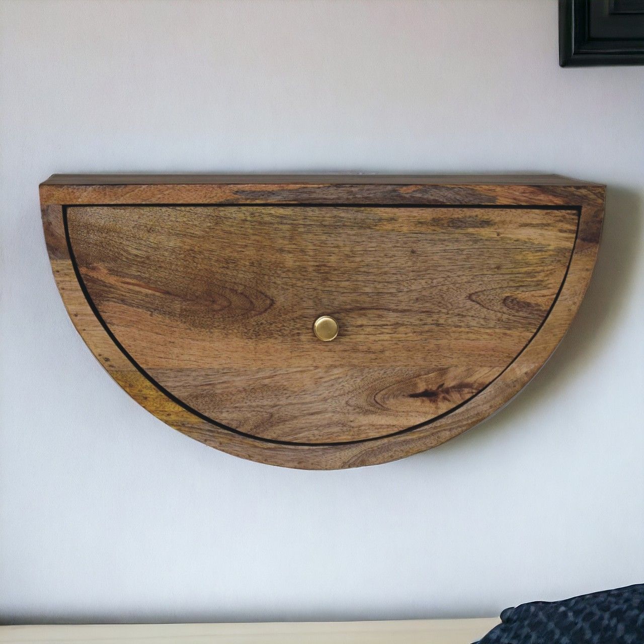 - Solid wood Crescent Floating Nightstand - Introducing our wall-mounted nightstand, a charming addition to your bedroom. With its crescent shape and 1 drawer, it combines elegance and functionality. Crafted from 100% solid mango wood in a oak-ish finish it has a shiny brass knob that adds a touch of sophistication.