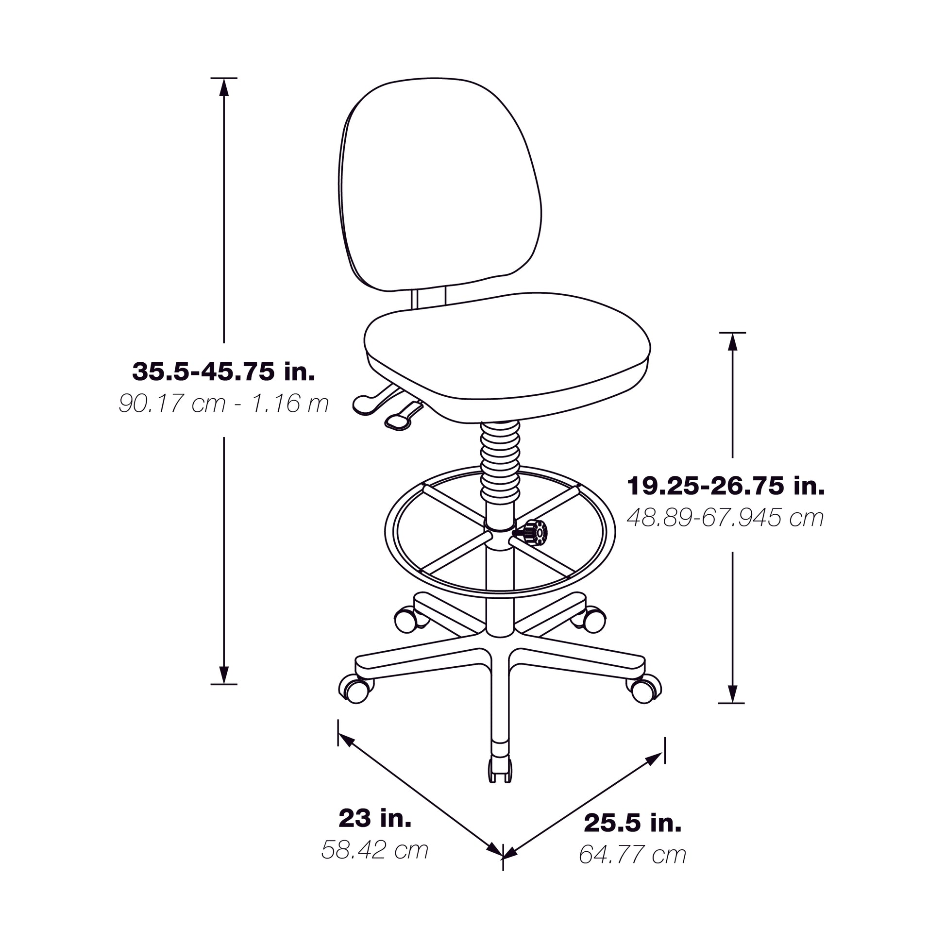Deluxe Ergonomic Drafting Chair with 20" Diameter Foot ring . Fabric Seat and Back Tilt Adjustment with Adjustable Foot ring. Pneumatic Height Adjustment 19.5" to 27". Heavy Duty Nylon Base with Dual Wheel Carpet Casters