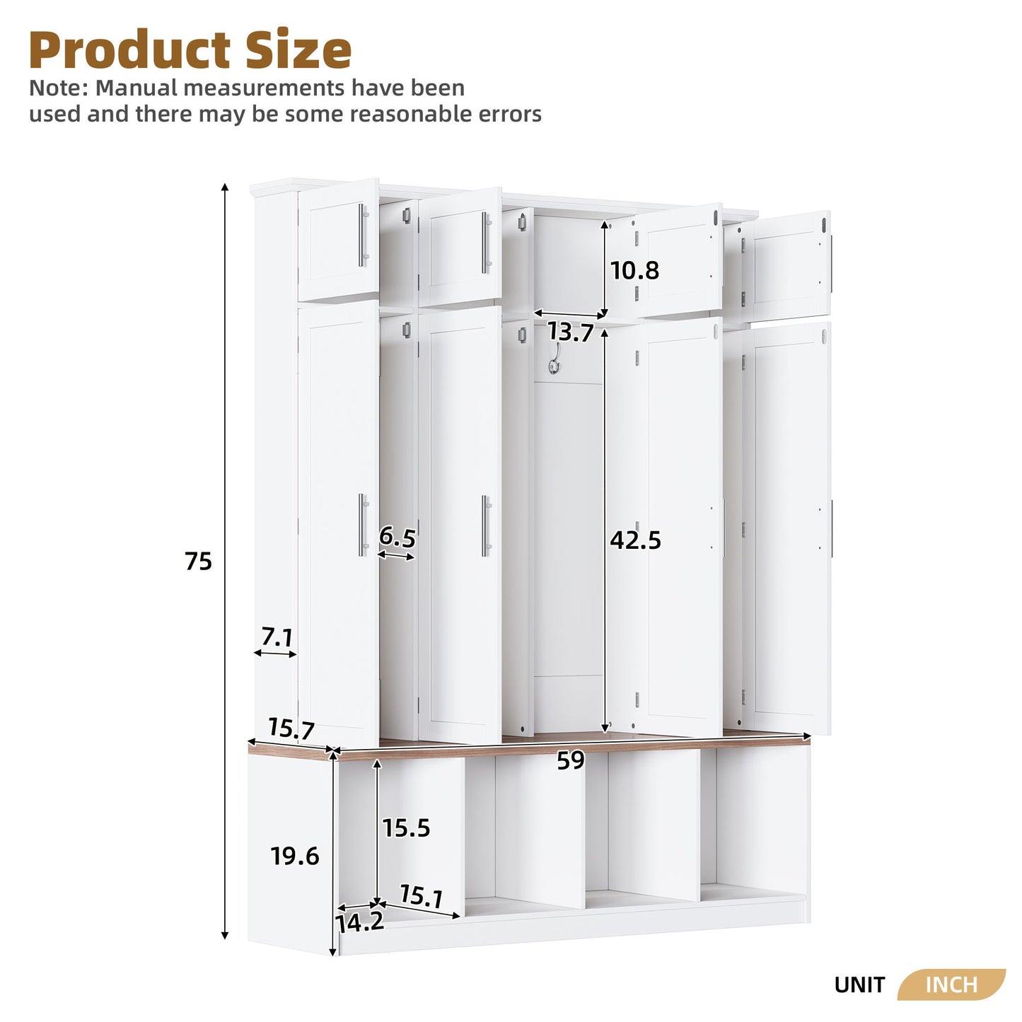 Farmhouse Hall Tree With 4 Hidden Hanging Hooks, Versatile Seating Bench With 8 Doors, Entryway Shoe Cabinet With Open Compartments For Living Room - White