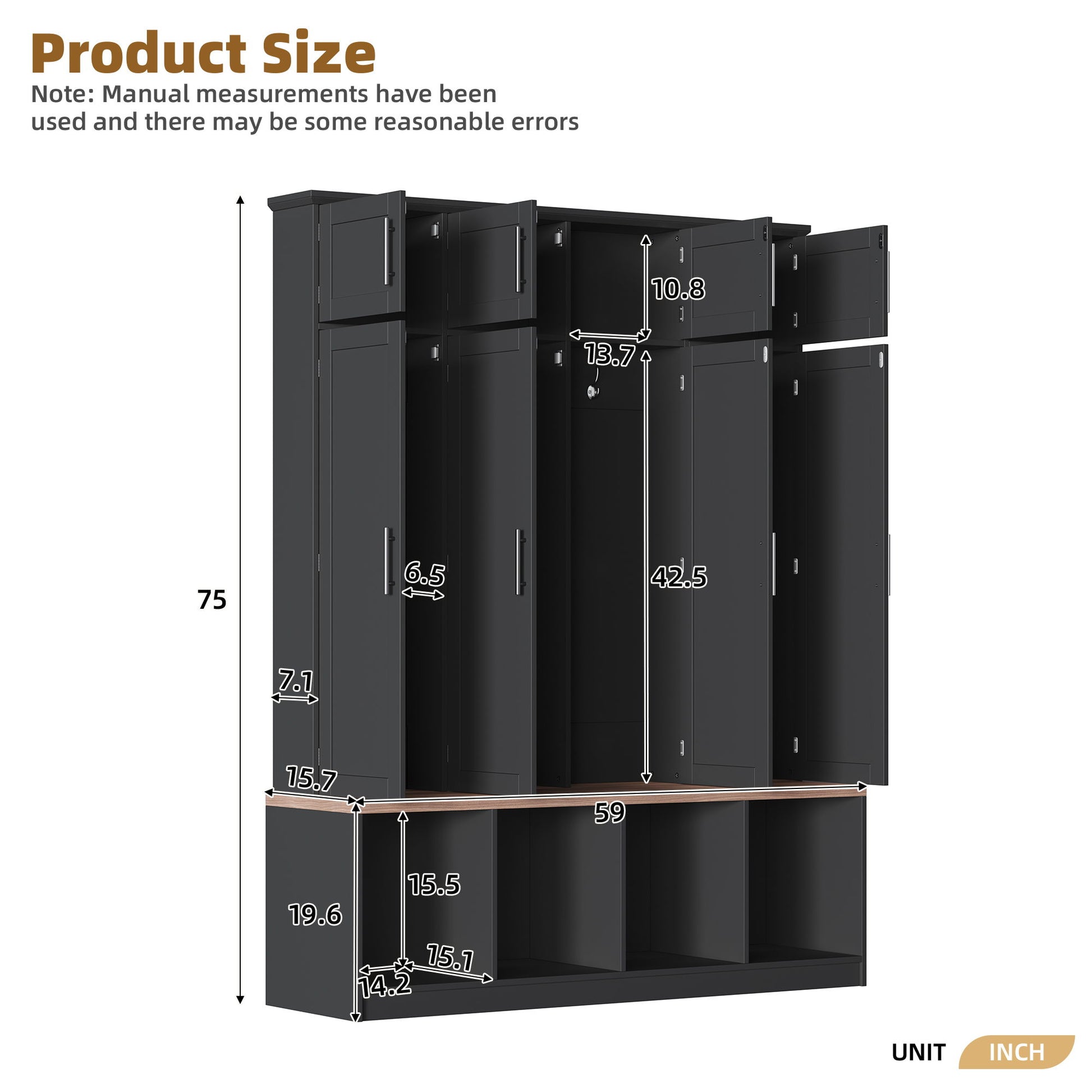Farmhouse Hall Tree With 4 Hidden Hanging Hooks, Versatile Seating Bench With 8 Doors, Entryway Shoe Cabinet With Open Compartments For Living Room - Black