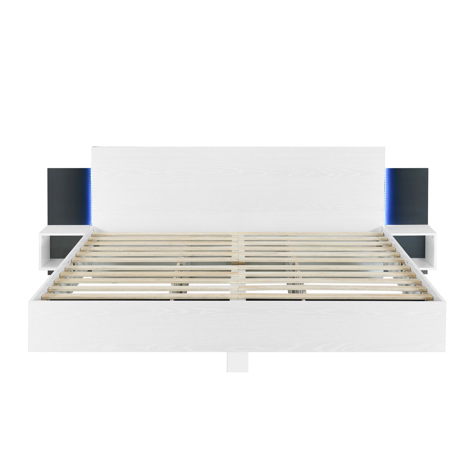 King Size Floating Platform Bed, With LED Lights, Bedside Nightstand - White