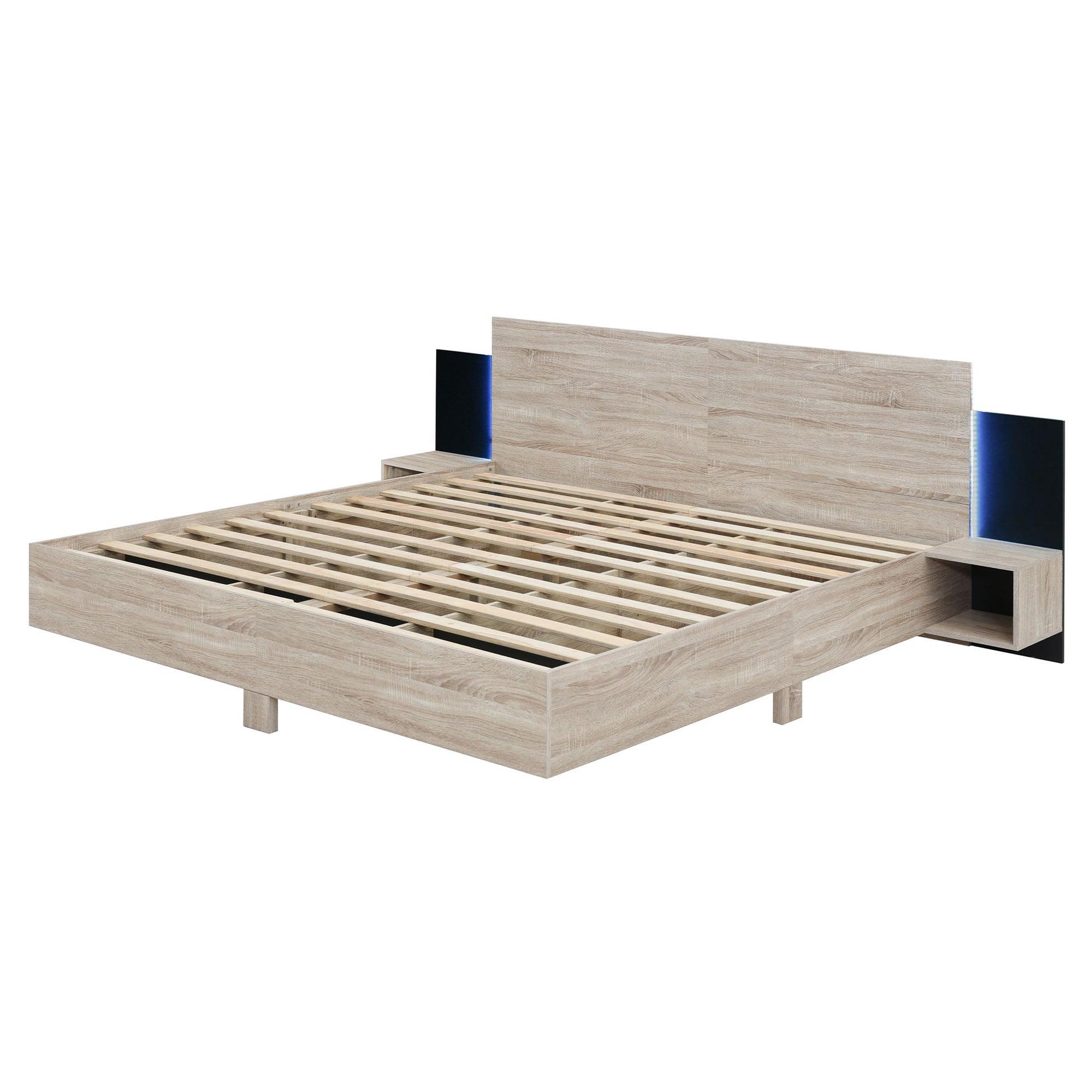 King Size Floating Platform Bed, With LED Lights, Bedside Nightstand - Natural