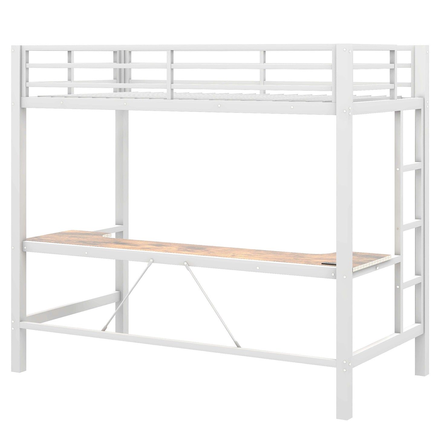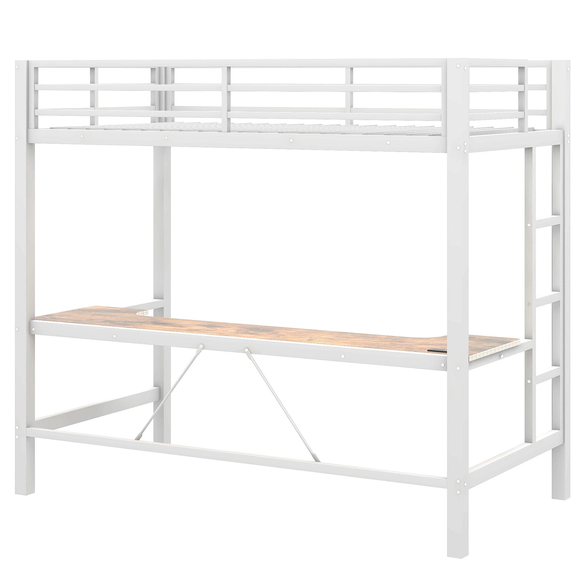 Twin Size Gaming Metal Loft Bed Frame With LED Light, USB Charge Station And Desk - White