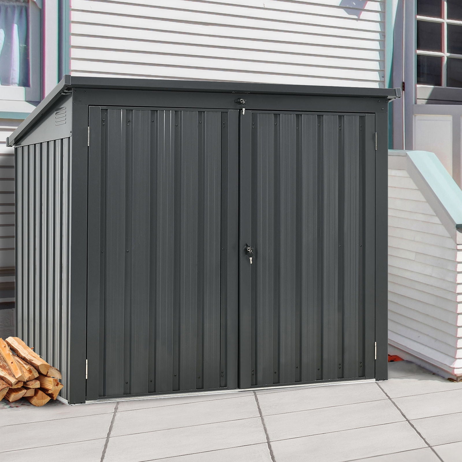 - Multi-Use Functionality: This versatile metal shed is ideal for storing various outdoor items, including trash cans, garden tools, firewood, bikes, or even serving as a pet house. It effectively protects your belongings from wind, rain, and sun.