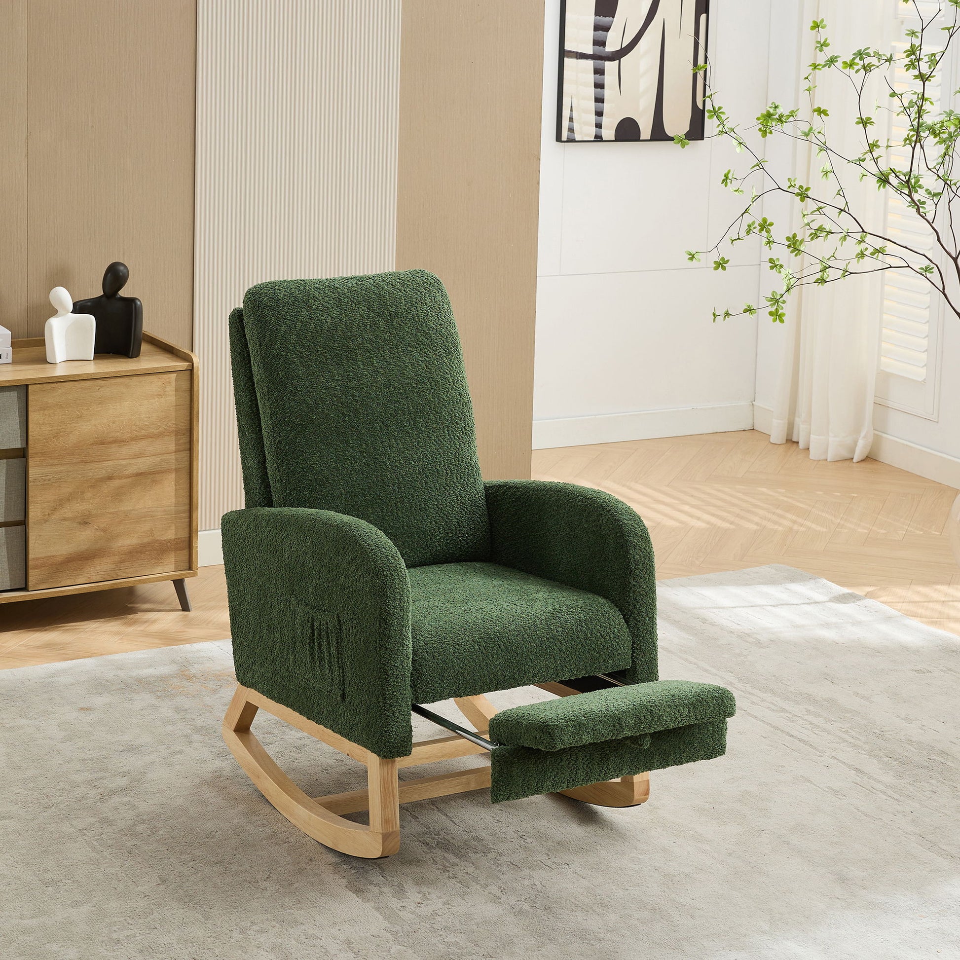 Boucle High Back Glider Rocking Chair With Retractable Footrest And Rubber Wood Legs For Nursery And Living Room - Green