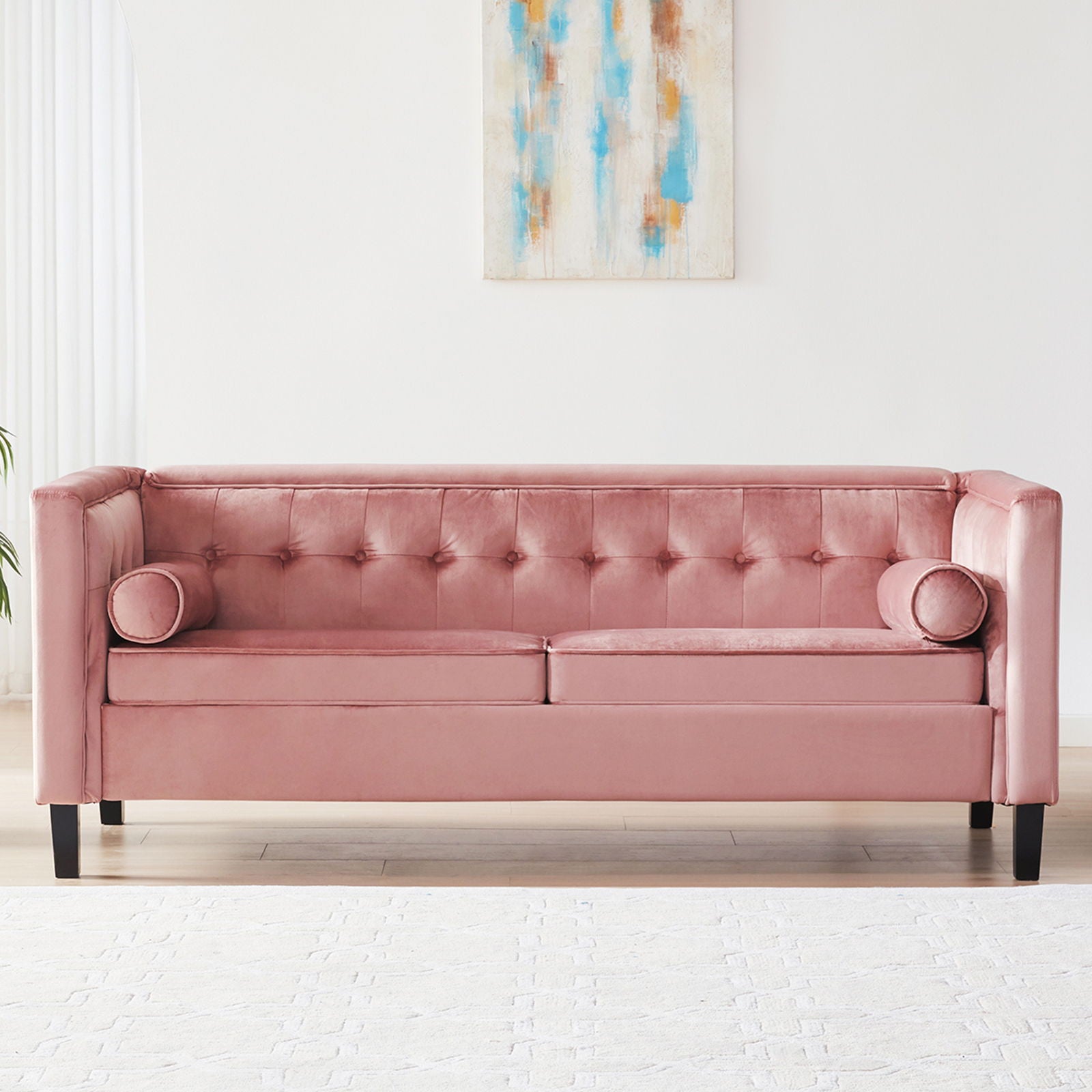 Mid-Century Velvet Sofa, Love Seats Sofa Furniture With Bolster Pillows, Button Tufted Couch For Living Room, Tool - Free Assembly - Pink