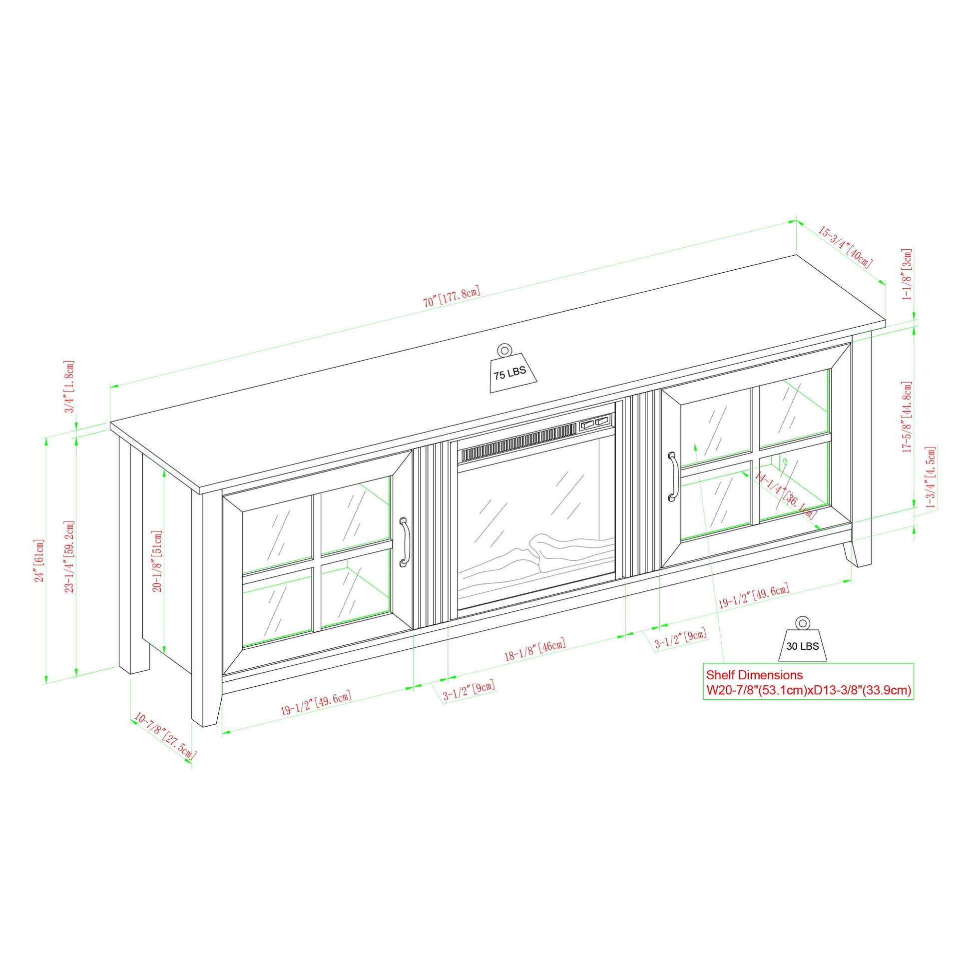 70.0"W x 16.0"D x 24.0"H - 91.0 lb