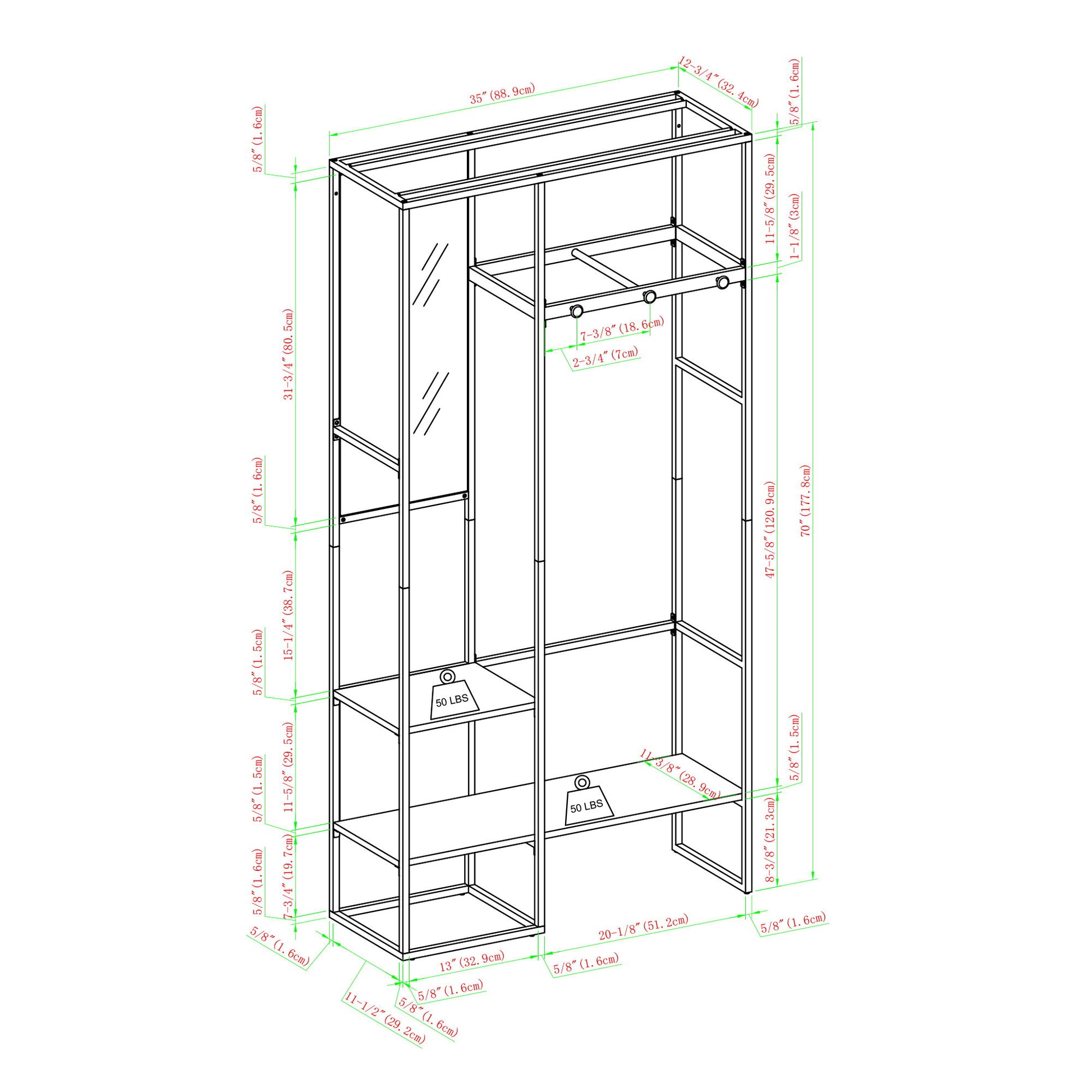 35.0"W x 12.75"D x 70.0"H - 33.0 lb