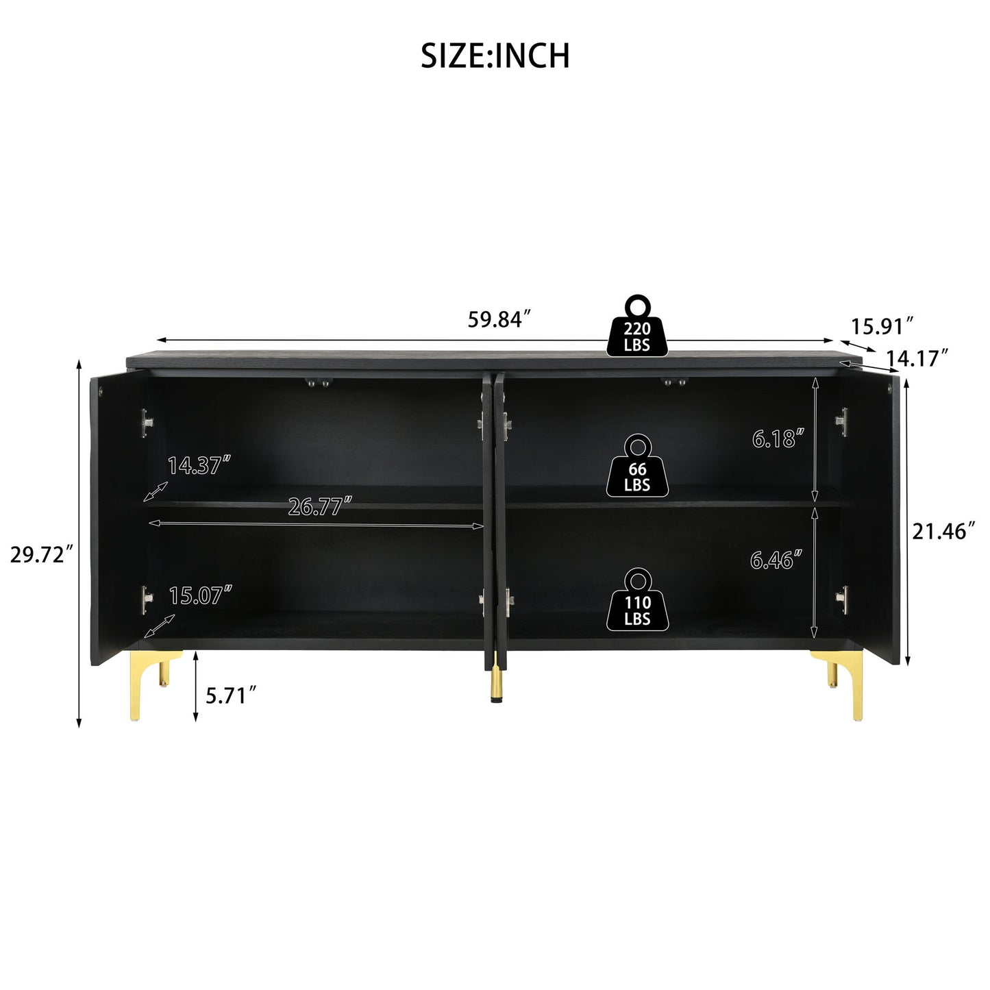 Modern Sideboard Buffet Cabinet With Handleless Press To Open Design, Carved Credenza Storage Cabinet With 4 Doors Construction - Black