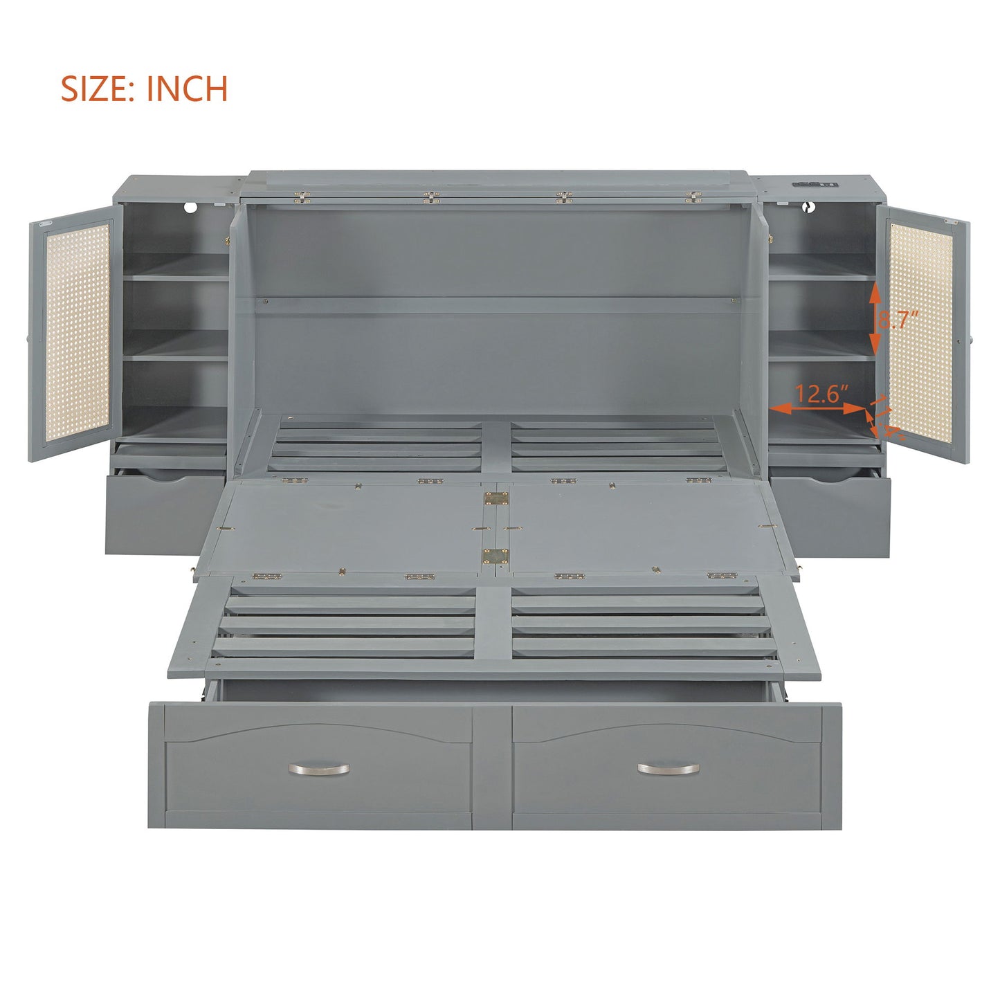 Full Size Murphy Bed With Drawer And Rattan Decoration - Gray