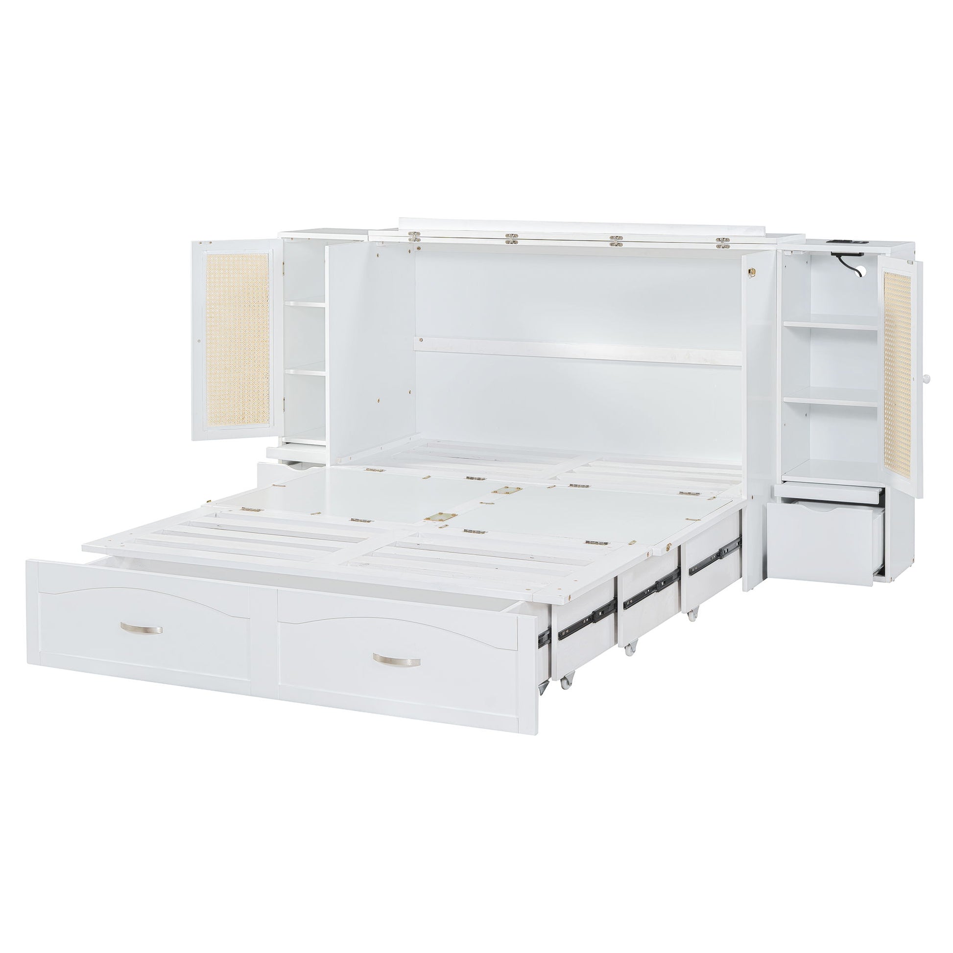 Full Size Murphy Wall Bed With Drawer And Rattan Decoration - White