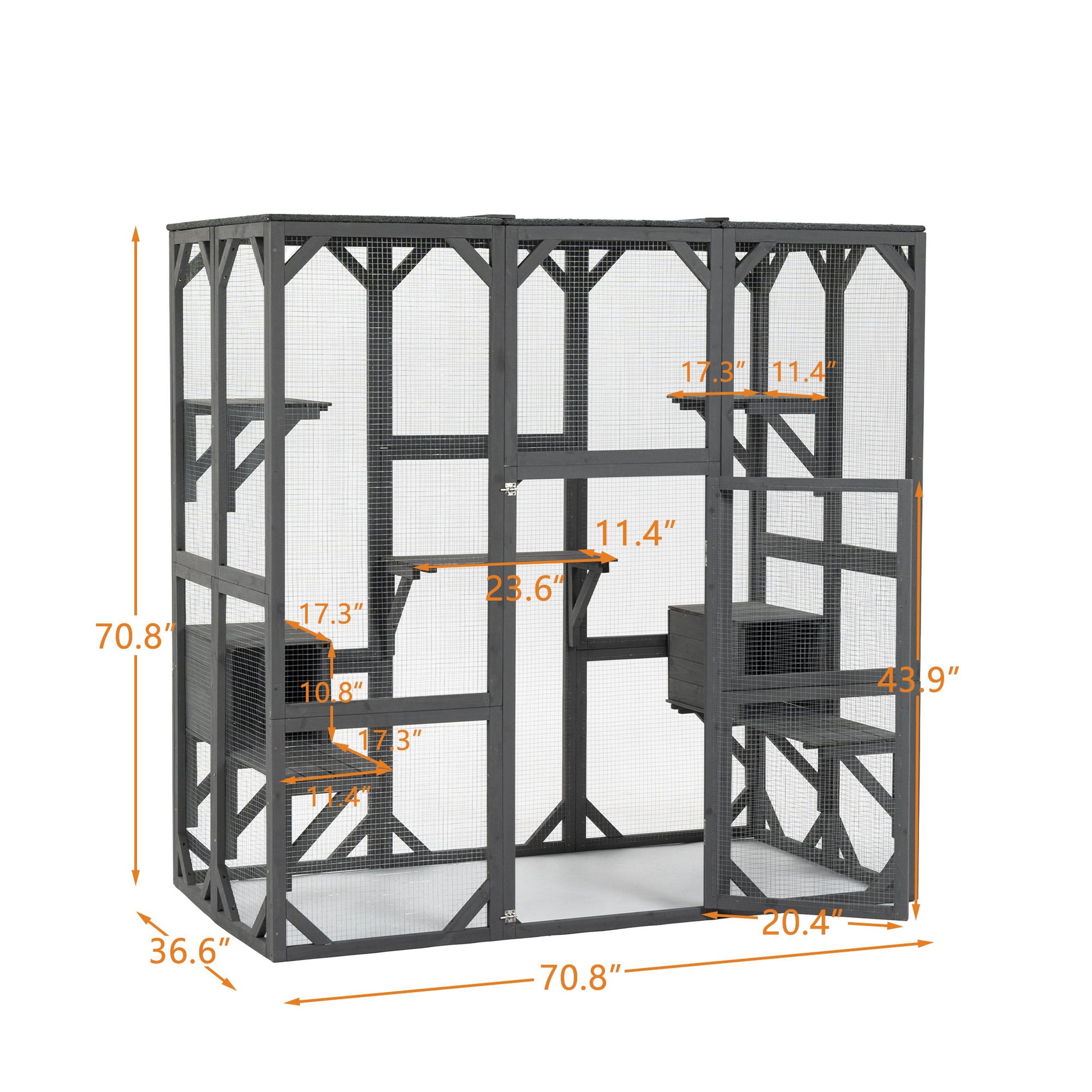Outdoor Cat House Wooden Catio Enclosure With Cover - Large Cat Cage With Jump Platforms And Condos, Weatherproof - Gray