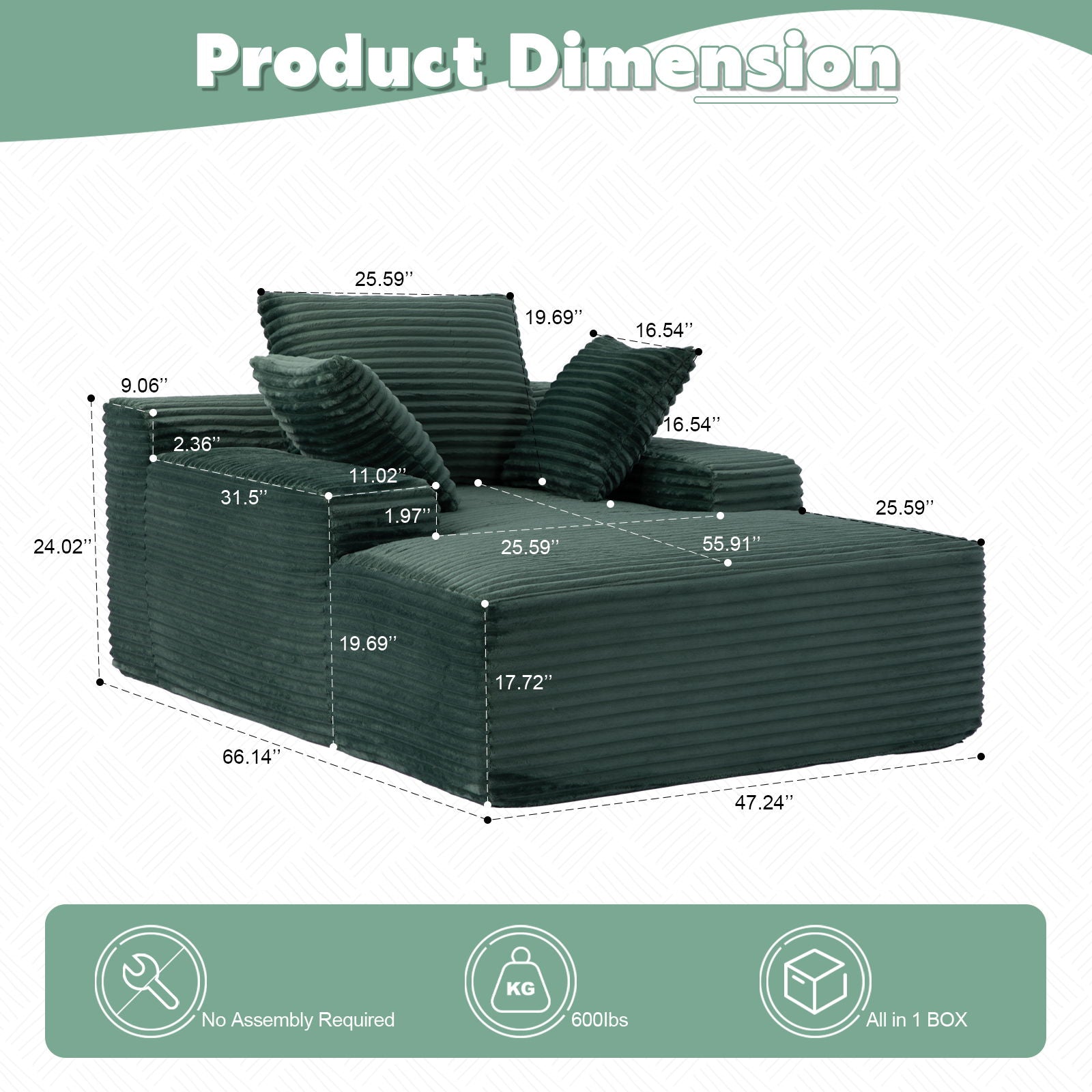 Oversized Chaise Lounge Chair Cozy Cloud Couch, Plush Corduroy Upholstered Sleeper Sofa Daybed With 3 Throw Pillows And Wide Armrest For Living Room - Green