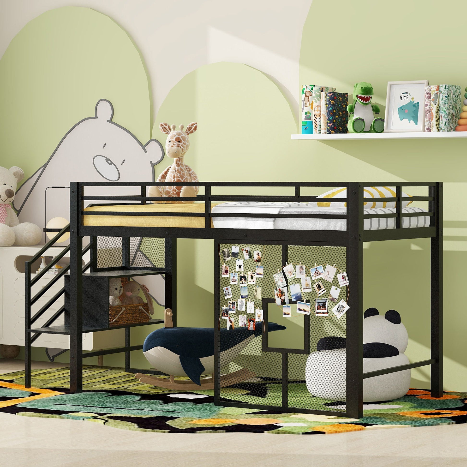 Twin Low Loft Bed Frame With Storage Staircase - Black