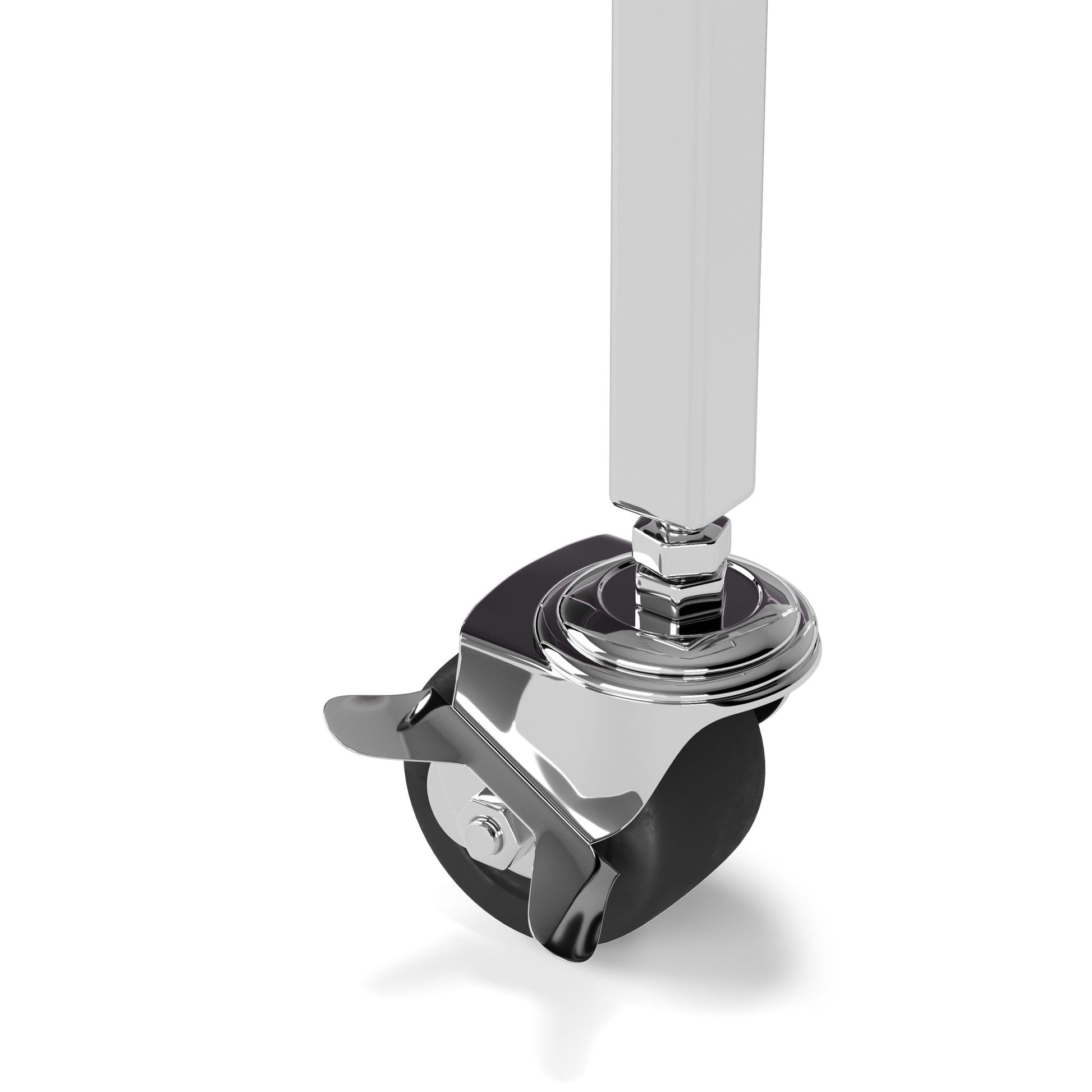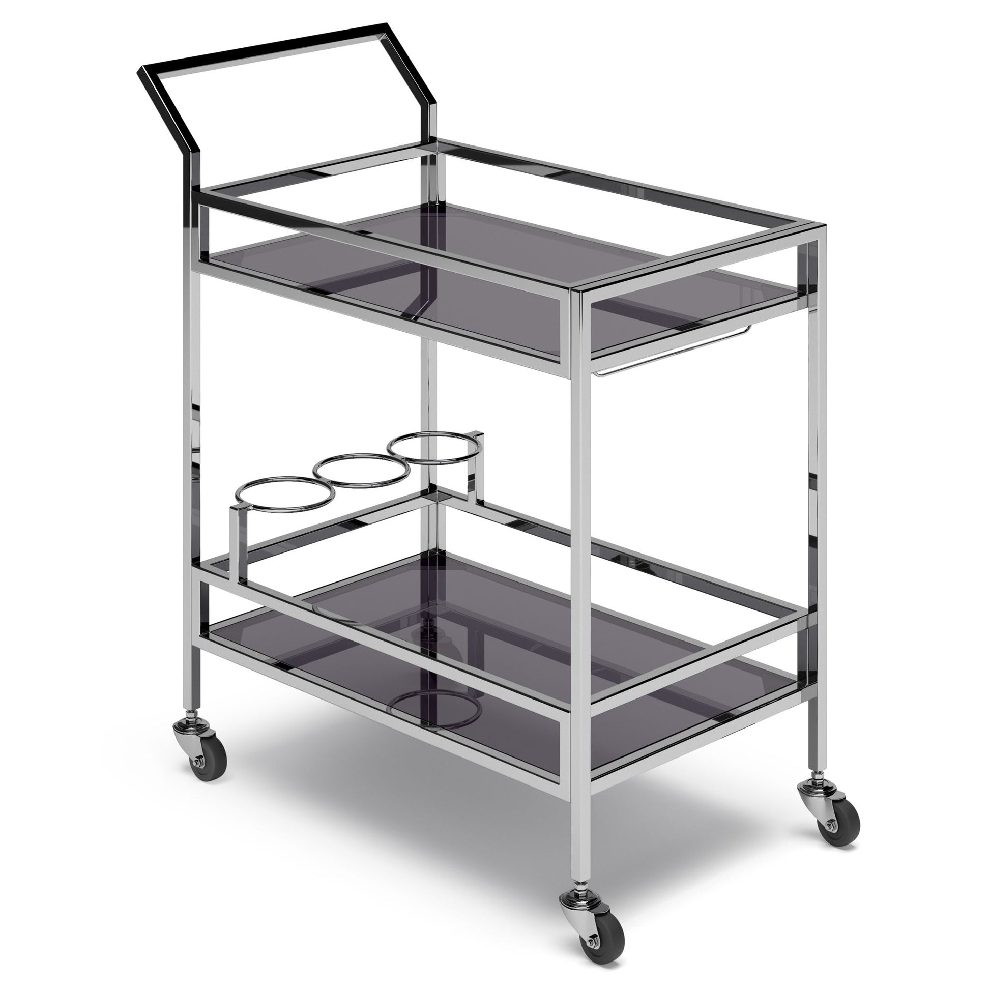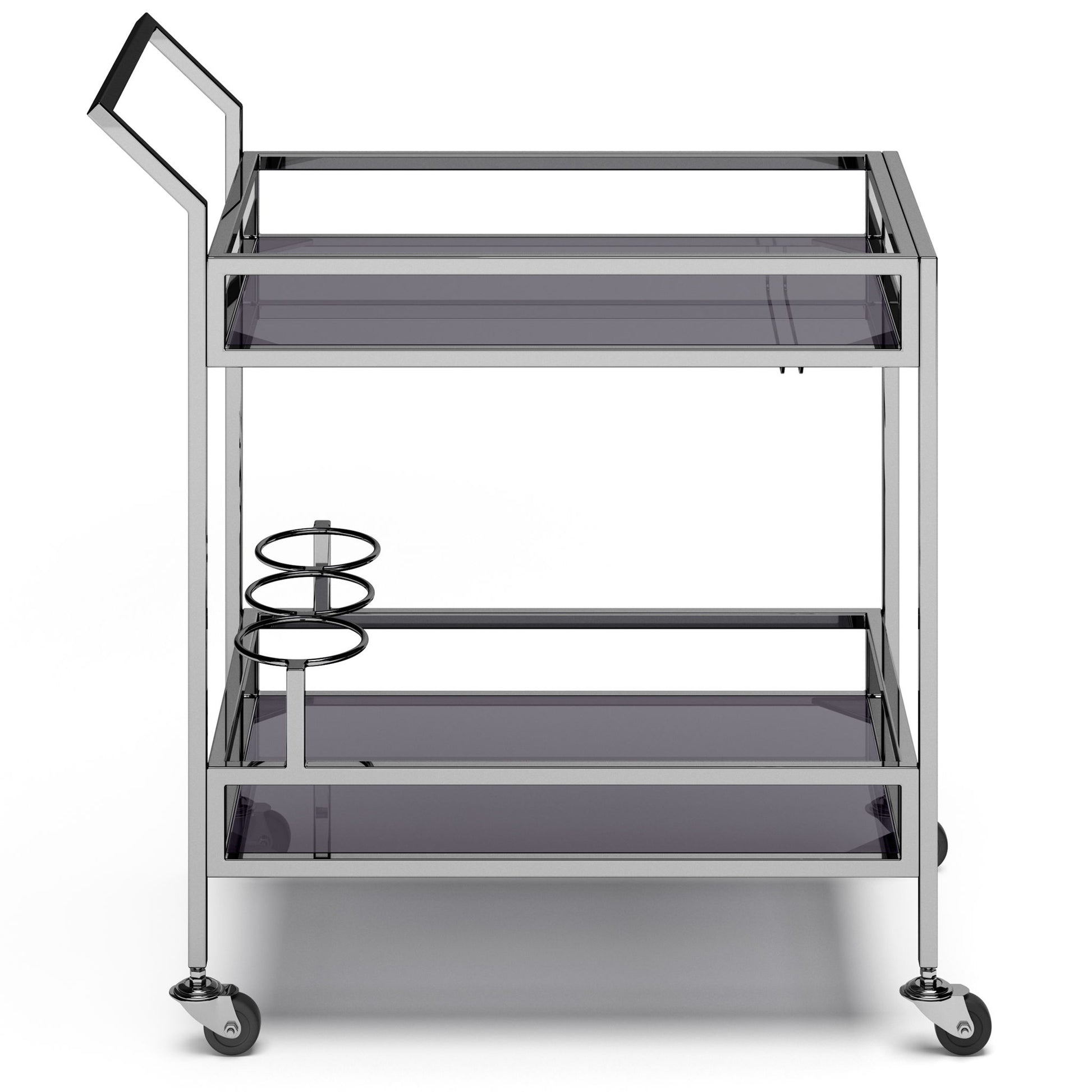 - Features Black toughened glass top and bottom shelves, one rack for hanging glasses, three rings for bottle storage, four caster wheels Γ’β¬β two that lock and handle/pull